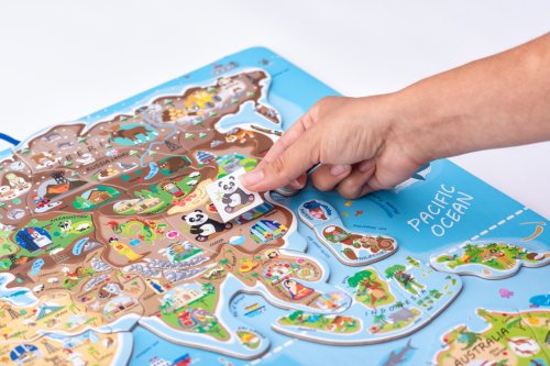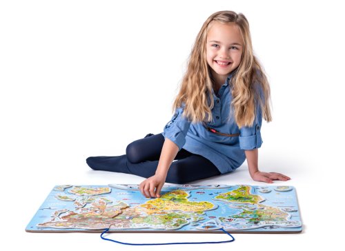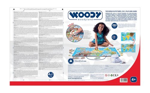 Naučné puzzle a společenská hra v jednom! Dítě nejprve přikládá dílky znázorňující jednotlivé státy nebo území na magnetickou plochu. Ta je barevně rozlišena podle světadílů. Hranice jednotlivých zemí jsou vyznačeny tenkou červenou linkou. Dítě se tak učí nejprve podle tvarů a barev poznat, kam jednotlivé dílky patří. Později už bezpečně ví a osvojí si znalost, kde a na jakém kontinentu se jednotlivé země nacházejí. S kompletně poskládanou mapou si pak s rodiči nebo kamarády zahrají hru, která bystří smysly a trénuje postřeh. Design a kresby pocházejí od českých návrhářů. Věk: 3+. Rozměr: 77 x 47 x 0,5 cm. Návod ke hře: Poskládejte jednotlivé dílky mapy na správná místa, položte vše na stůl nebo na zem a hrací plocha je připravena. Připravte si i hrací pytlík, ve kterém máte umístěny kartičky s obrázky. Na začátku hry si hráči mezi sebou vyberou vedoucího hry. Každý z hráčů si vylosuje 2 kartičky z pytlíku. Při losování má zavřené oči, odkloní hlavu od pytlíku, kartičky sevře do dlaně a teprve potom může oči otevřít, aniž by se je snažil zahlédnout. Vedoucí hry odstartuje hru pokynem "start" a všichni hráči se podívají na kartičky, které si vylosovali. Snaží se co nejrychleji najít na hrací ploše obrázky vyobrazené na svých kartičkách, ty poté položí na příslušné místo. Kdo umístí své kartičky na hrací plochu jako první, řekne "stop". Hra je okamžitě zastavena a ostatní hráči musejí přestat hledat. Jakmile je správnost umístění obrázků zkontrolována, každý hráč si posbírá obrázkové kartičky, které našel na svoji hromádku. Ostatní kartičky jsou vráceny zpět do pytlíku, zamíchány a hra pokračuje, dokud kartičky nedojdou. Vyhrává ten, kdo má na konci hry nejvíce kartiček. Penalizace: Pokud některý z hráčů umístí kartičku na hrací plochu špatně, vrací ji do pytlíku a další kolo nehraje. Hra pro 2-4 hráče. Obsahuje: základní desku, magnetické dílky, papírové hrací kartičky, hrací pytlík a pravidla hry