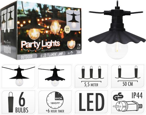 Světelný řetěz LED PARTY 6 žárovek, celková délka 5,5 m, vzdálenost žárovek 50 cm, přívodní kabel 3 m, barva LED: teplá bílá, 230 V, IP 444 adaptér