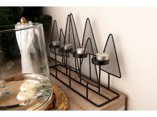 Kovový svícen ve tvaru stromku o rozměru 380 × 90 × 250 mm pojme 4 čajové svíčky. Elegantní černé provedení vytváří slavnostní a moderní atmosféru. Stabilní konstrukce zajišťuje bezpečné umístění svíček a dekorativní efekt, vhodný pro stolní aranžmá nebo samostatnou výzdobu.