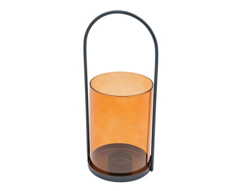 Dekorativní, skleněný svícen se vyrábí strojově z tónovaného skla. Na kovovém dně je připraven podstavec pro svíčku. Design je velice jednoduchý, hladký a přímočarý, doplněný kovovým uchem. Rozměry: průměr 10 cm, výška 27 cm. Barva: oranžová.