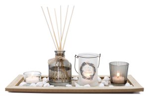 Obsahuje svíčku, kalíšky na čajovou svíčku a zmíněný difuzér s ratanovými tyčinkami.