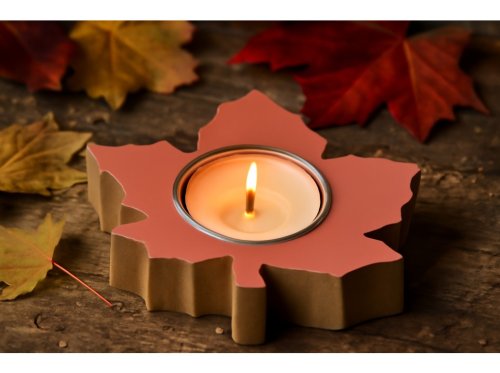 Dřevěný svícen ve tvaru javorového listu na čajovou svíčku v pastelově oranžové barvě.