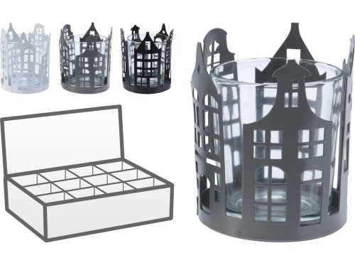 Kovový svícen o rozměru 60×80 mm určený pro čajovou svíčku, zdobený motivem domků. Barevné provedení je dodáváno v mixu, jednotlivé kusy se mohou lišit odstínem i vzhledem dekoru.