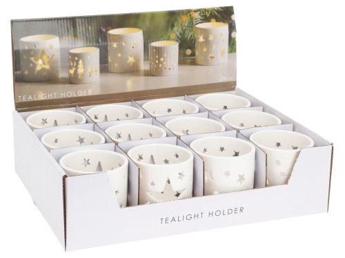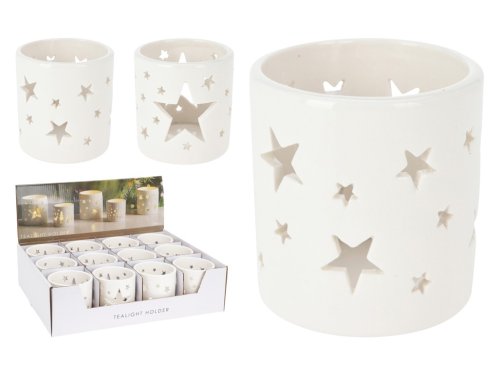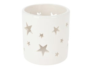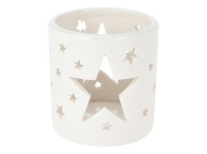 Porcelánový svícen na čajosou svíčku, s výřezy s motivem hvězd, navodí útulnou atmosféru.
