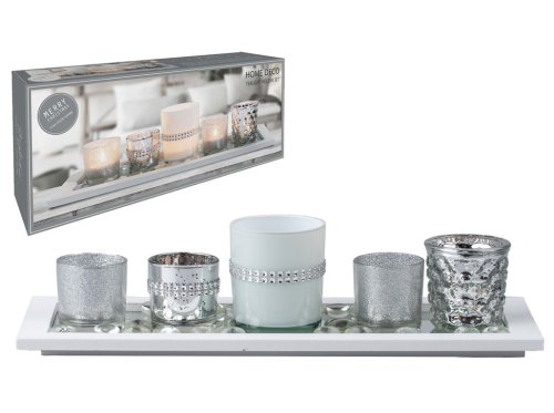 Sada šesti skleněných svícnů o rozměru 190 × 70 × 90 mm je umístěna na dřevěném tácku. Kombinace bílé a stříbrné barvy dodává interiéru elegantní a moderní vzhled. Skleněné svícny poskytují bezpečné umístění svíček a vytvářejí příjemnou atmosféru, vhodné pro stolní aranžmá nebo slavnostní dekorace.
