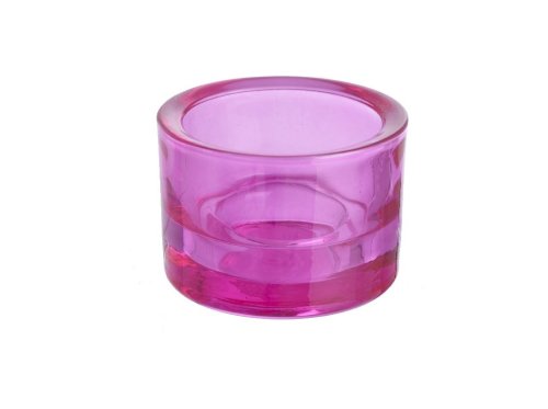 Skleněný svícen v růžové barvě, ideální pro umístění čajové svíčky. Jeho rozměry jsou 57x83 mm.