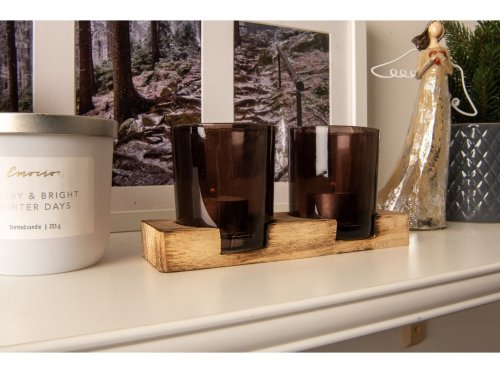 Sada dvou skleněných svícnů o rozměru 190 × 70 × 90 mm je umístěna na dřevěném tácku a nabízí barevný mix pro atraktivní dekoraci. Sklo vytváří jemné a hřejivé světlo, zatímco dřevěný podstavec dodává přírodní a rustikální vzhled. Svícny jsou ideální pro stolní aranžmá, parapet nebo slavnostní dekorace.