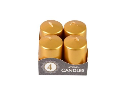 průměr: 3,8 cm výška: 6 cm barva: metalická zlatá, lesklá balení: 4 ks doba hoření: 7 hodin / 1 svíčka