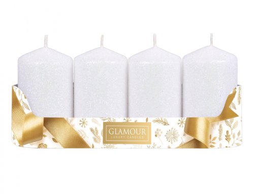 Sada glitrovaných adventních svíček válcovitého tvaru se špičatou hlavou. Adventnímu věnci dodá třpyt a slavnostní nádech. Průměr 5 cm, výška 8 cm. Doba hoření: 26 hodin. V balení jsou 4 kusy. Barva: bílá.