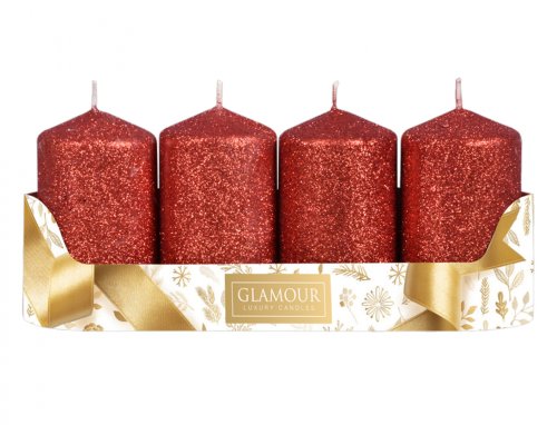 Sada glitrovaných adventních svíček válcovitého tvaru se špičatou hlavou. Adventnímu věnci dodá třpyt a slavnostní nádech. Průměr 5 cm, výška 8 cm. Doba hoření: 26 hodin. V balení jsou 4 kusy. Barva: červená.