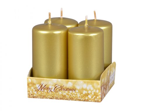 Adventní svíčky s rovnou hlavou v lesklém a hladkém metalickém provedení. Adventním věncům dodají jiskru. Doba hoření: 14 hodin. Rozměry: průměr 4 cm, výška 8cm. V balení jsou 4 ks svíček. Barva: zlatá.