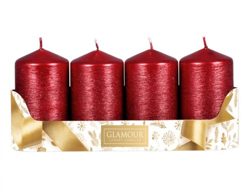 Škrábaná adventní svíčka s metalickým lesklým povrchem, dozdobeným jemnými glitry. Hlava je rovná, zaoblená. Dekorativní vzhled ozvláštní každý vánoční svícen či věnec. Průměr: 5 cm, výška: 9 cm. Doba hoření: 30 hodin. V balení jsou 4 kusy. Barva: červená.