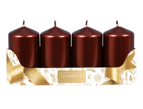 Sada adventních svíček. Mají tvar válce a povrch mají hladký, v úpravě metalický lesk. Jsou jednoduché a zároveň velmi efektní. Doba hoření: 30 hodin. Rozměr: průměr 5 cm, výška 9 cm. Balení obsahuje 4 ks svíček. Barva: bordó.
