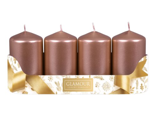 Sada adventních svíček. Mají tvar válce a povrch mají hladký, v úpravě metalický lesk. Jsou jednoduché a zároveň velmi efektní. Doba hoření: 30 hodin. Rozměr: průměr 5 cm, výška 9 cm. Balení obsahuje 4 ks svíček. Barva: růžovo-zlatá.