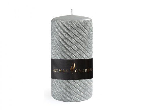 Svíčka ve tvaru válce je ozdobena vyrytými rotujícími proužky. Barva: stříbrná. Průměr: 7 cm, výška: 14 cm.