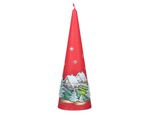 Vánoční svíčka ve tvaru jehlanu, s plastickou aplikací zasněžených chaloupek, působí dekorativně a hodí se zejména pro období Vánoc a zimy. Povrch je matný, vhodný do klasických i moderních interiérů a dodává jim zimní atmosféru. Vhodná jako doplněk na sváteční stůl nebo jako dárek. Rozměry: průměr 7 cm, výška 14 cm. Barva: červená.