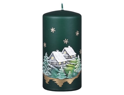 Vánoční svíčka ve tvaru válce, s plochou hlavou, s plastickou aplikací zasněžených chaloupek, působí dekorativně a hodí se zejména pro období Vánoc a zimy. Povrch je matný, vhodný do klasických i moderních interiérů a dodává jim zimní atmosféru. Vhodná jako doplněk na sváteční stůl nebo jako dárek. Doba hoření: 84 hodin. Rozměry: průměr 7 cm, výška 14 cm. Barva: zelená.