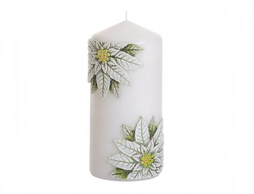 Vánoční svíčka ve tvaru válce s glitrovaným povrchem. Doba hoření: 45 hodin. Barva: bílá a zelená. v: 5 cm, výška: 13 cm.