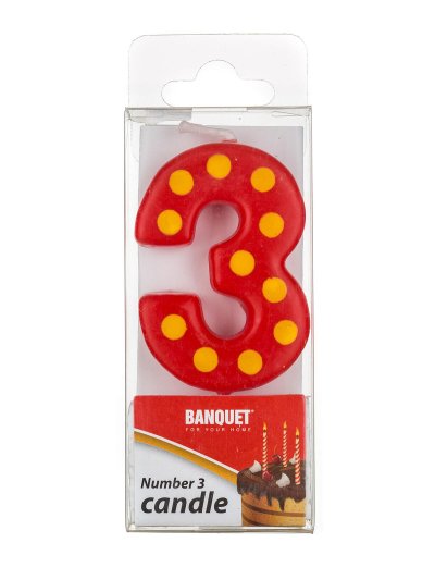 Svíčka narozeninová - číslo 3, velikost svíčky 5 x 3 cm, součástí svíčky je plastový bodec. Výrobek využijete na oslavě, zahradní párty, pikniku apod.