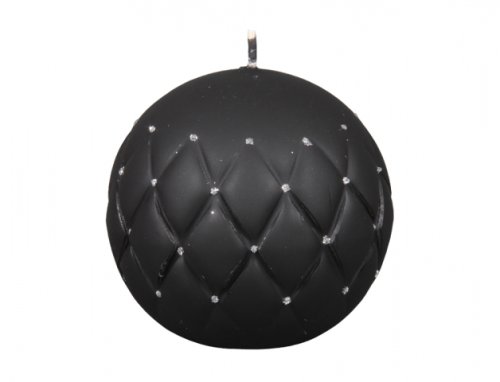 Černá matná svíčka ve tvaru koule je ozdobena stříbrnými kamínky. Průměr: 10 cm.