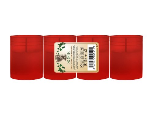doba hoření: 4 x 15 hod výška: 6 cm hmotnost: 45 g parafín materiál: plast barva: červená balení: 4 ks