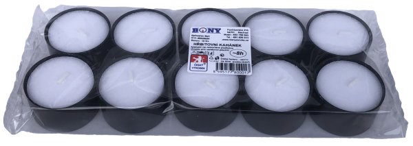 Svíčka v plastovém černém obalu určená pro venkovní použití například na hřbitovy. Doba hoření až 8 hodin. Doba hoření je závislá na klimatických podmínkách. Baleno po 10-ti kusech.