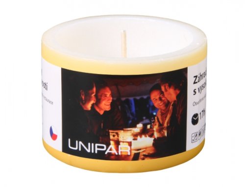 Zahradní svíčka s vysokou svítilností je vhodná k osvětlení zahrady, altánu či skalky. Okraje jsou vyšší, plamínek je tak odolný vůči větru. Hoří 15 hodin. Barva: žlutá. Průměr: 8 cm, výška: 6 cm.