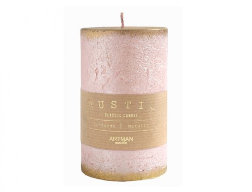 Rustikální svíčka ve tvaru válce. Ručně dělaná svíčka má metalický povrch s úpravou patina. Bude se vyjímat v moderním, dobovém i rustikálním interiéru. Rozměry: průměr 7cm, výška 12cm. Doba hoření: 65h. Barva: růžová.
