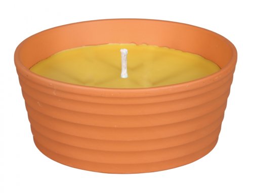 Vonná svíčka v terakotové žardince. Svíčka má jeden knot a voní po citronele, tradičnímu nástroji na odpuzování obtížného hmyzu. Vhodná pro použití v exteriéru. Hmotnost náplně: 250 g. Rozměry: průměr 13 cm, výška 6 cm. Barva: žlutá.