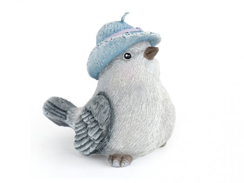 Figurální svíčka v podobě ptáčka s kloboukem. Barva: šedá. Šířka: 10 cm, výška: 10 cm.