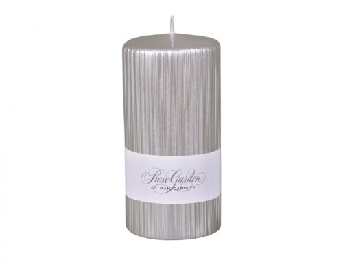 Svíčka ve tvaru válce s reliéfním zdobením v podobě svislých proužků. Jednoduché zdobení je dělá mnohostranně využitelnými. Doba hoření: 84 hod. Rozměry: průměr 7 cm, výška 14 cm. Barva: stříbrná.