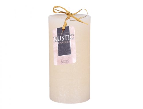 Béžová rustikální svíčka ve tvaru válce. Hoří: 73 hodin. Průměr: 7 cm, výška: 14 cm.