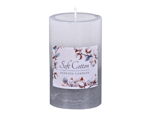 Dekorativní rustikální svíčka s jemnou vůní čisté bavlny provoní interiér svěžím a uklidňujícím aroma. Tříbarevné provedení s plynulým přechodem tónů podtrhuje její elegantní vzhled. Vhodná pro celoroční použití i jako doplněk dekorací. Hoří rovnoměrně až 65 hodin. Rozměry: průměr 7 cm, výška 12 cm. Barva: bílo-šedá.