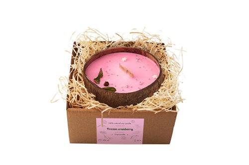 Svíčka v kokosu - Sojové svíčky v kokosové skořápce jsou krásnou ozdobou a dekorací. Vůně Frozen Cranberry je příjemná sladká vůně brusinek doplněná o nádechy černého bezu a jablka. Svíčky neobsahují parafín, který je vedlejším produktem ropného průmyslu. Spalováním parafínu se do vzduchu uvolňují nebezpečné toxiny, které potom vdechujeme. Svíčka obsahuje bavlněný knot, tedy čistě přírodní, bez obsahu boraxu, do kterého se jinak knoty namáčí, aby se uměle docílilo lepšího hoření. Do vosku jsou přidány pouze kvalitní esenciální oleje z lokálních zdrojů. Svíčky jsou odlévány a zdobeny ručně. Každá se tedy od sebe trochu liší. Sojový vosk hoří přibližně dvakrát déle, než ten parafínový, u 100 g vosku je to +- 20 hodin.
