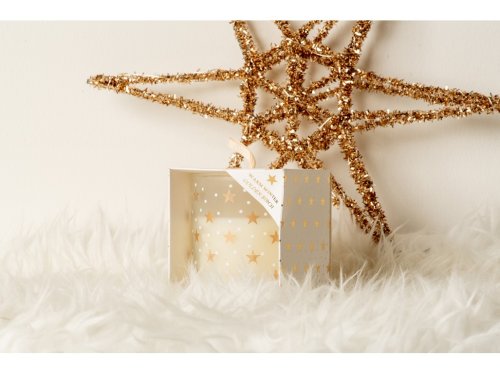 Vonná svíčka ve skle o rozměru 80×100 mm s dekorativními motivy vloček a hvězd. Skleněné provedení je dodáváno v mixu čiré, stříbrné a zlaté barvy, jednotlivé kusy se mohou lišit motivem i barevným laděním. Svíčka je balena v dárkové krabičce.