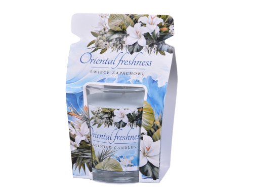 Dekorativní vonná svíčka ve skle s jemným potiskem voní po svěžích orientálních tónech a navozuje pocit čistoty. Barevně sladěné tóny vosku ladí s decentním vzhledem svíčky. Součástí je dárkový papírový přebal. Doba hoření: 32 hodin. Hmotnost náplně: 130 g. Barva: světle modrá.