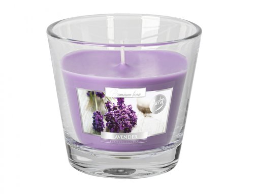 Svíčky ve skle s vůní levandule. Barva: fialová. Doba hoření: 26 hod. Hmotnost: 160 g.