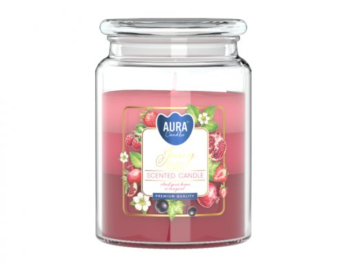 Vonná svíčka ve skleněné dóze s víkem. Ozdobená ovocem, použitém ve vonné kompozici. Voní po šťavnatém ovoci. Vosk je tónován do třech různých a vzájemně ladících odstínů pro ještě lepší zážitek ze svíčky. Doba hoření: 100 hodin. Hmotnost 500 g. Rozměry: průměr 10 cm, výška 14 cm. Barva: červená.