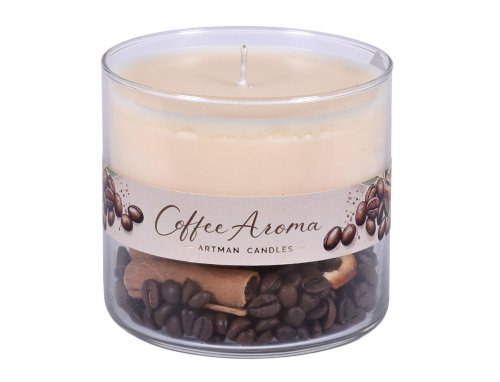 Dekorativní vonná svíčka ve skle s vůní čerstvě mleté kávy vytváří příjemnou a hřejivou atmosféru. Intenzivní aroma kávy doplněné o jemný kořenitý tón působí povzbudivě a navozuje pocit pohody. Spodní část svíčky je dekorována kávovými zrny, skořicí a plátky sušeného ovoce, které zvýrazňují její přirozený vzhled. Skleněná nádoba se hodí jako elegantní doplněk interiéru i jako originální dárek. Doba hoření přibližně 33 hodin. Hmotnost: 270 g. Rozměry: průměr 10 cm, výška 9 cm. Barva: béžová.