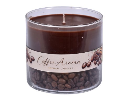 Dekorativní vonná svíčka ve skle s vůní čerstvě mleté kávy vytváří příjemnou a hřejivou atmosféru. Intenzivní aroma kávy doplněné o jemný kořenitý tón působí povzbudivě a navozuje pocit pohody. Spodní část svíčky je dekorována kávovými zrny, skořicí a plátky sušeného ovoce, které zvýrazňují její přirozený vzhled. Skleněná nádoba se hodí jako elegantní doplněk interiéru i jako originální dárek. Doba hoření přibližně 33 hodin. Hmotnost: 270 g. Rozměry: průměr 10 cm, výška 9 cm. Barva: hnědá.