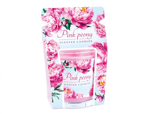 Vonná svíčka ve skle s papírovou etiketou a papírovým přebalem, zdobené bohatými květy růžových pivoněk. Bude krásným dárkem. Kolem sebe bude šířit něžnou vůni pivoněk. Doba hoření: 32 h. Hmotnost náplně: 130 g. Rozměry: průměr 7,4 cm, výška 8,3 cm. Barva: růžovo-fialová.