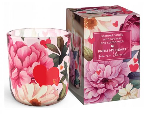 Prémiová vonná svíčka ve skle. Je vyrobena ze sójového vosku a má bavlněný knot. Potěší smyslnou květinovou vůní. Sklo svíčky i krabička ve které je zabalena jsou zdobené květinovými motivy a srdíčky. Vhodný jako dárek, zejména o valentýnu. Hmotnost náplně je 150 g. Doba hoření: 33 hodin. Barva: růžová, bílá.