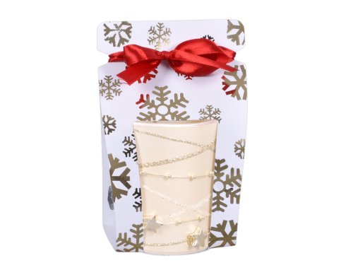 Vonná svíčka ve skle ozdobeném glitrovými proužky a hvězdičkami. Sklo je umístěno v dárkové papírové krabičce s mašličkou. Hmotnost náplně: 130 g. Výška: 8,3 cm, šířka: 7,4 cm.