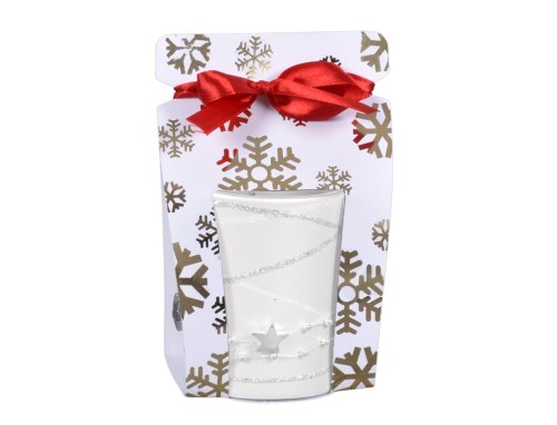 Vonná svíčka ve skle ozdobeném glitrovými proužky a hvězdičkami. Sklo je umístěno v dárkové papírové krabičce s mašličkou. Hmotnost náplně: 130 g. Výška: 8,3 cm, šířka: 7,4 cm.