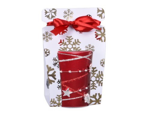 Vonná svíčka ve skle ozdobeném glitrovými proužky a hvězdičkami. Sklo je umístěno v dárkové papírové krabičce s mašličkou. Hmotnost náplně: 130 g. Výška: 8,3 cm, šířka: 7,4 cm.
