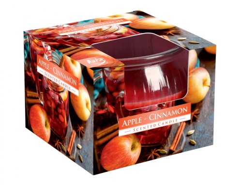 Vonná svíčka ve skle. Vůně jablko-skořice je bohatou směsicí květinových, ovocných i dřevitých tónů. Má certifikát kvality RAL, který garantuje bezpečnost a kvalitu použitých materiálů. Skleněný obal je zaoblený a zdobený a v kombinaci s jasnou barvou vosku zútulní každý prostor. Balení: 1ks v dárkové krabičce. Doba hoření: 18 hodin. Hmotnost: 80g. Rozměr: průměr 7,7cm, výška: 5,9cm. Barva: hnědočervená.