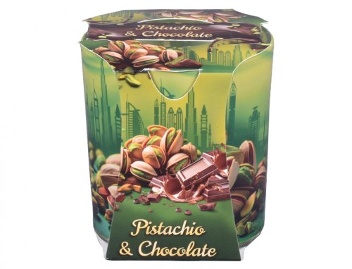 Vonná svíčka ve skle potažená fólií s dekorativním potiskem pistácií a čokolády, určená jako dekorace do bytu nebo jako dárek. Obsahuje éterické oleje a je vybavena knotem, který udržuje plamen stabilní. Voní po pistáciích s jemnou čokoládovou vůní, působí hřejivě a lahodně. Hmotnost náplně: 80 g. Doba hoření: 18 hodin. Rozměry: délka 7 cm, šířka 7 cm, výška 7,6 cm. Barva: tmavě zelená.
