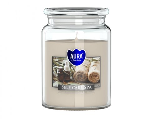 Vonná svíčka ve skleněné dóze s víkem. Ozdobená obrázkem z wellness, voní relaxačně. Doba hoření: 100 hodin. Hmotnost 500 g. Rozměry: průměr 10 cm, výška 14 cm. Barva: hnědošedá.
