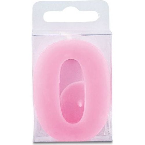 Svíčka ve tvaru číslice 0, růžová barva, výška 4 cm. Je vhodná především pro zdobení narozeninového dortu a podobných moučníků.