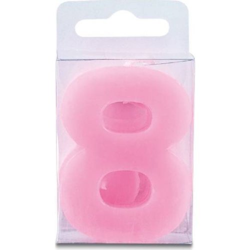 Svíčka ve tvaru číslice 8, růžová barva, výška 4 cm. Je vhodná především pro zdobení narozeninového dortu a podobných moučníků.
